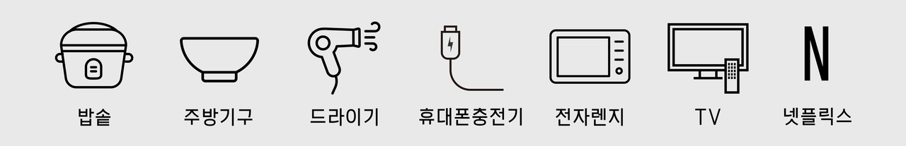 취사도구, TV(넷플릭스), 충전기 등이 기본으로 비치되어있습니다