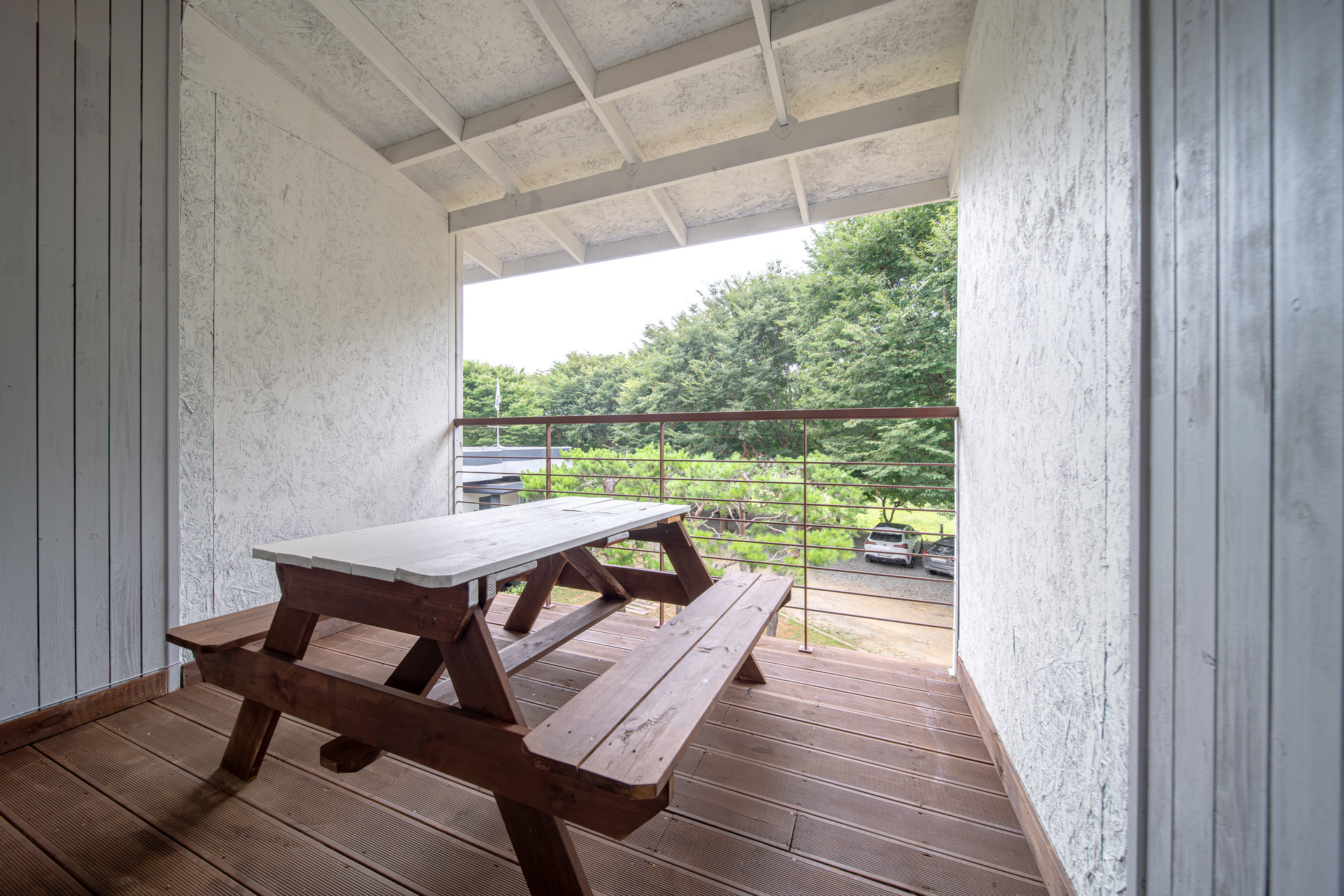 바로 앞에 흐르는 홍천강이 보이는 테라스에 바베큐가 가능한 가든테이블이 비치되어 있습니다