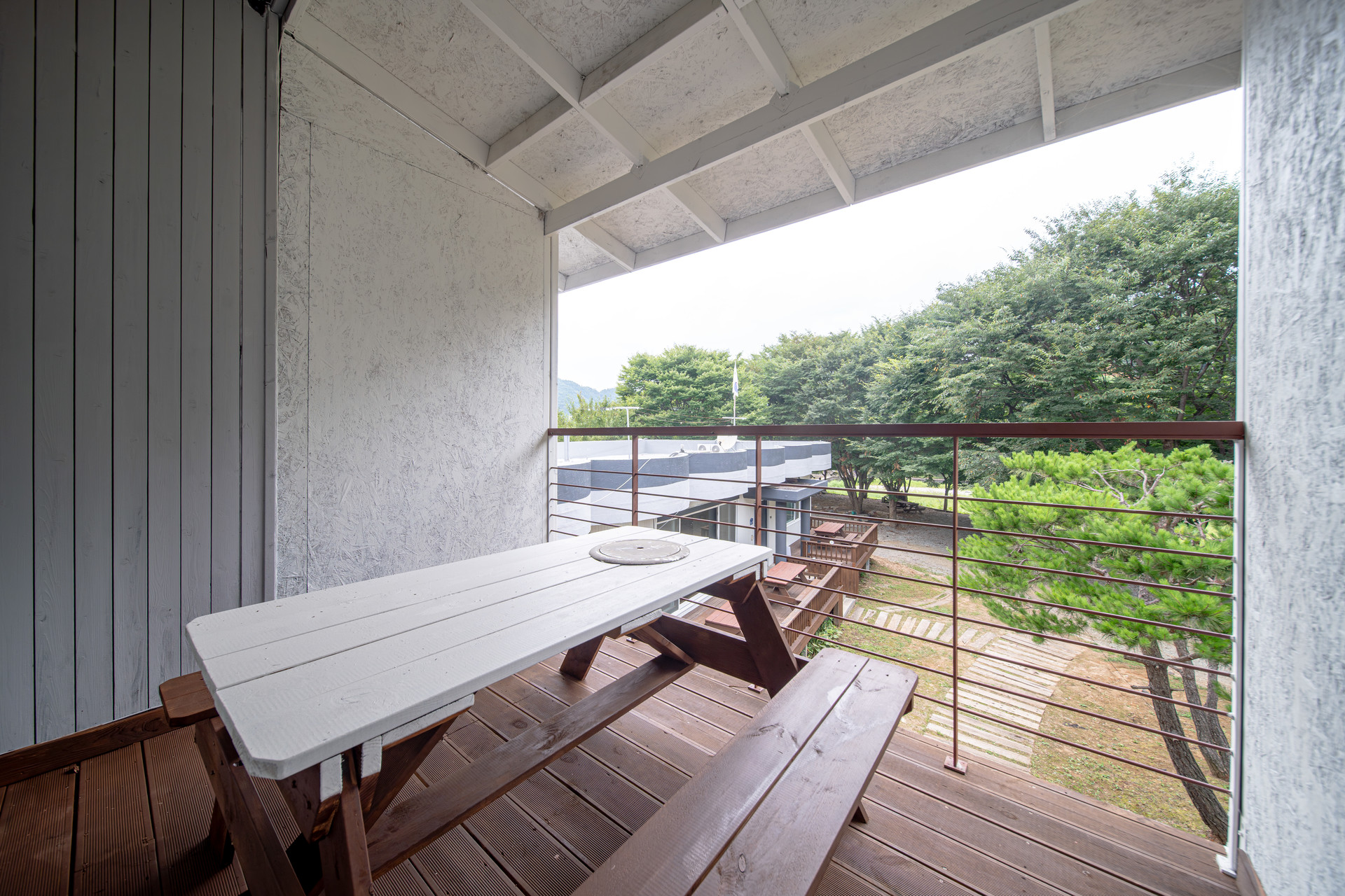 바로 앞에 흐르는 홍천강이 보이는 테라스에 바베큐가 가능한 가든테이블이 비치되어 있습니다